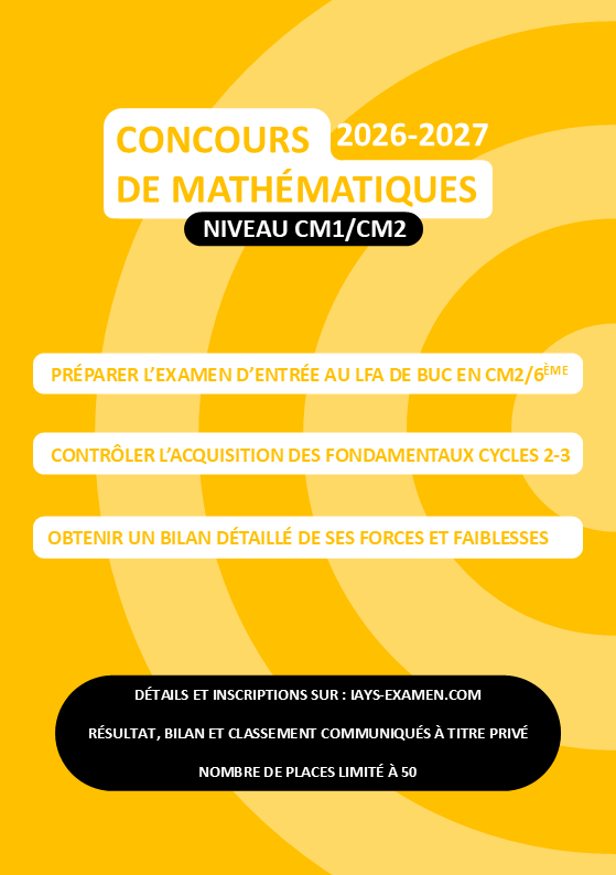 IAYS Examen n’a strictement rien à voir avec le LFA, et notre examen est ouvert à tous les CM1 et CM2. Notre volonté première est de donner la possibilité à des jeunes, appréciant les mathématiques, de se tester, et d’obtenir des conseils pour progresser dans cette magnifique matière. Pour ces deux examens, il n’existe pas pas d’annales. Ainsi, ne faites jamais confiance à quelqu’un qui voudrait vous en vendre. Cela n’existe pas !